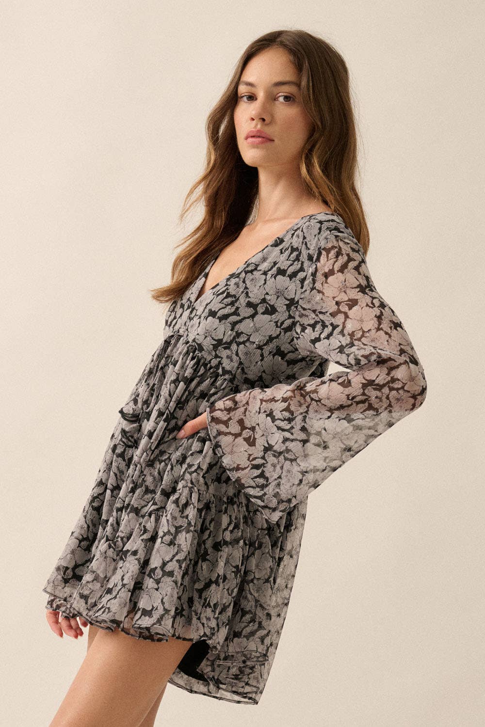 A floral-print romper with the following features: Textured chiffon fabric. Deep V neckline with hook closure. Drawstring waist with tie. Long bell sleeves. Wide-leg skort bottom with ruffle detail. High empire waist. Lettuce-edge cuffs and hem. Thigh length. Relaxed fit. Model Info: Height: 5 ft 10 in | Bust: 31 in | Waist: 23 in | Hips: 33 in | Wearing Size S.