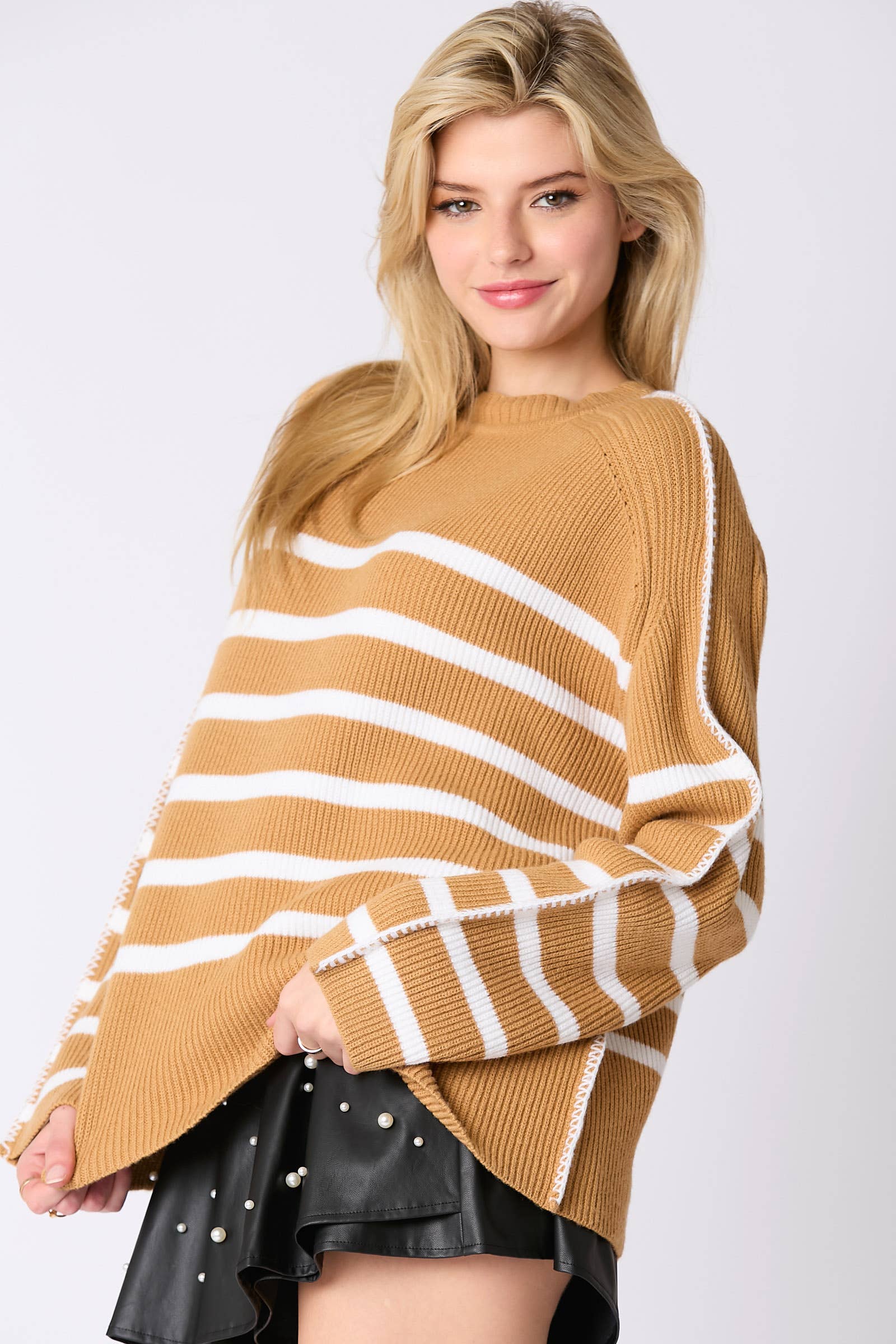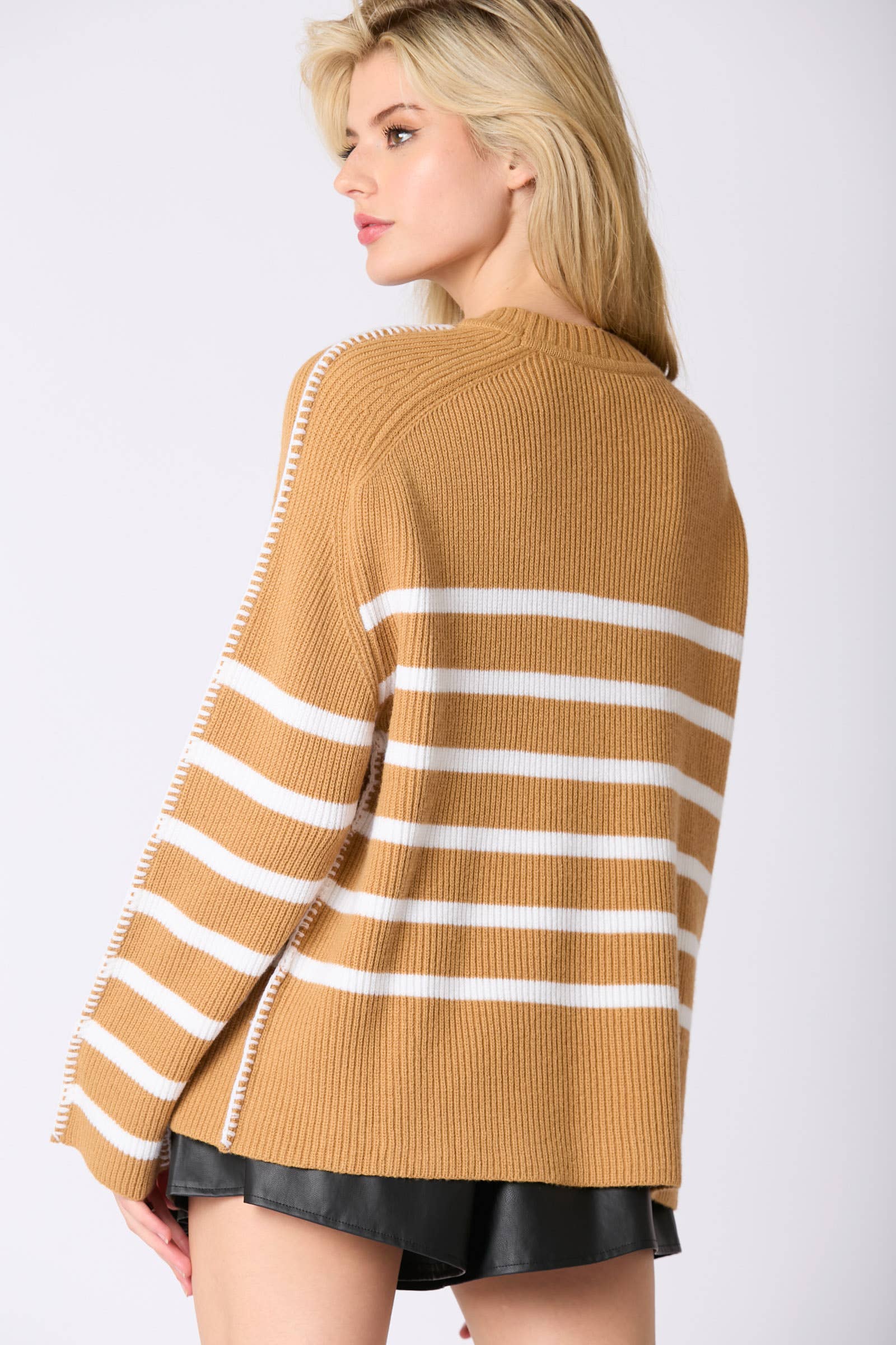 STITCH DETAIL STRIPE RAGLAN SLV SWEATER The Model is Wearing a Size Small. (HEIGHT: 5'6 / BUST: 33 / WAIST: 25 / HIPS: 35) Made in China