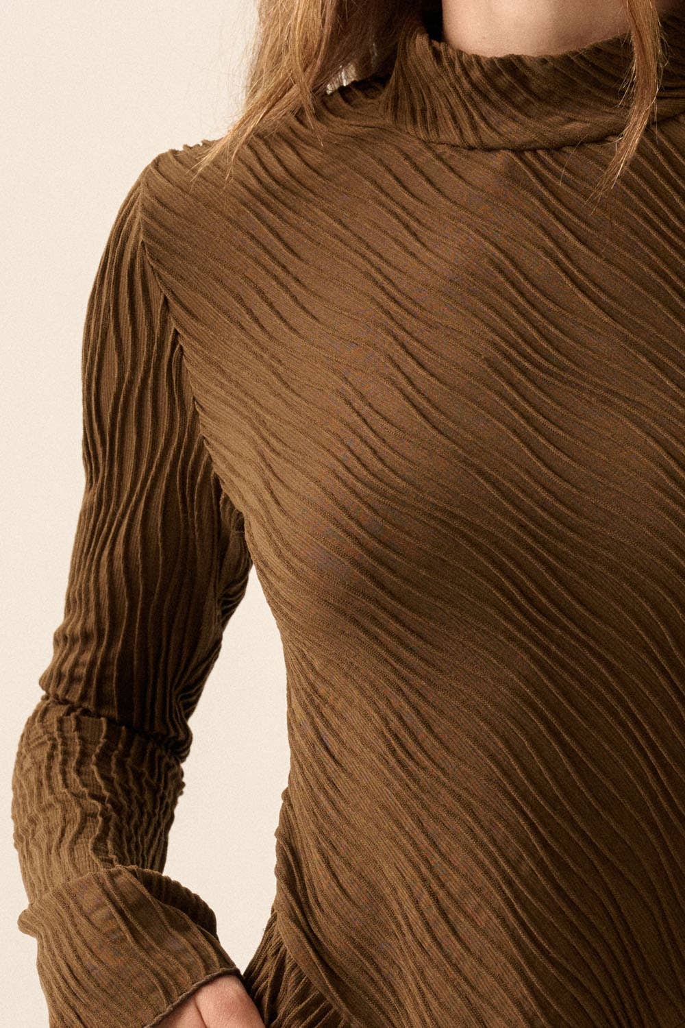 A solid knit mini dress with the following features: Rib-knit fabric with wavy pleats throughout. Mock neckline. Asymmetrical design. Long bell sleeves. A-line skirt. Thigh length. Fit-and-flare silhouette. Model Info: Height: 5 ft 9 in | Bust: 31 in | Waist: 24 in | Hips: 34 in | Wearing Size S.